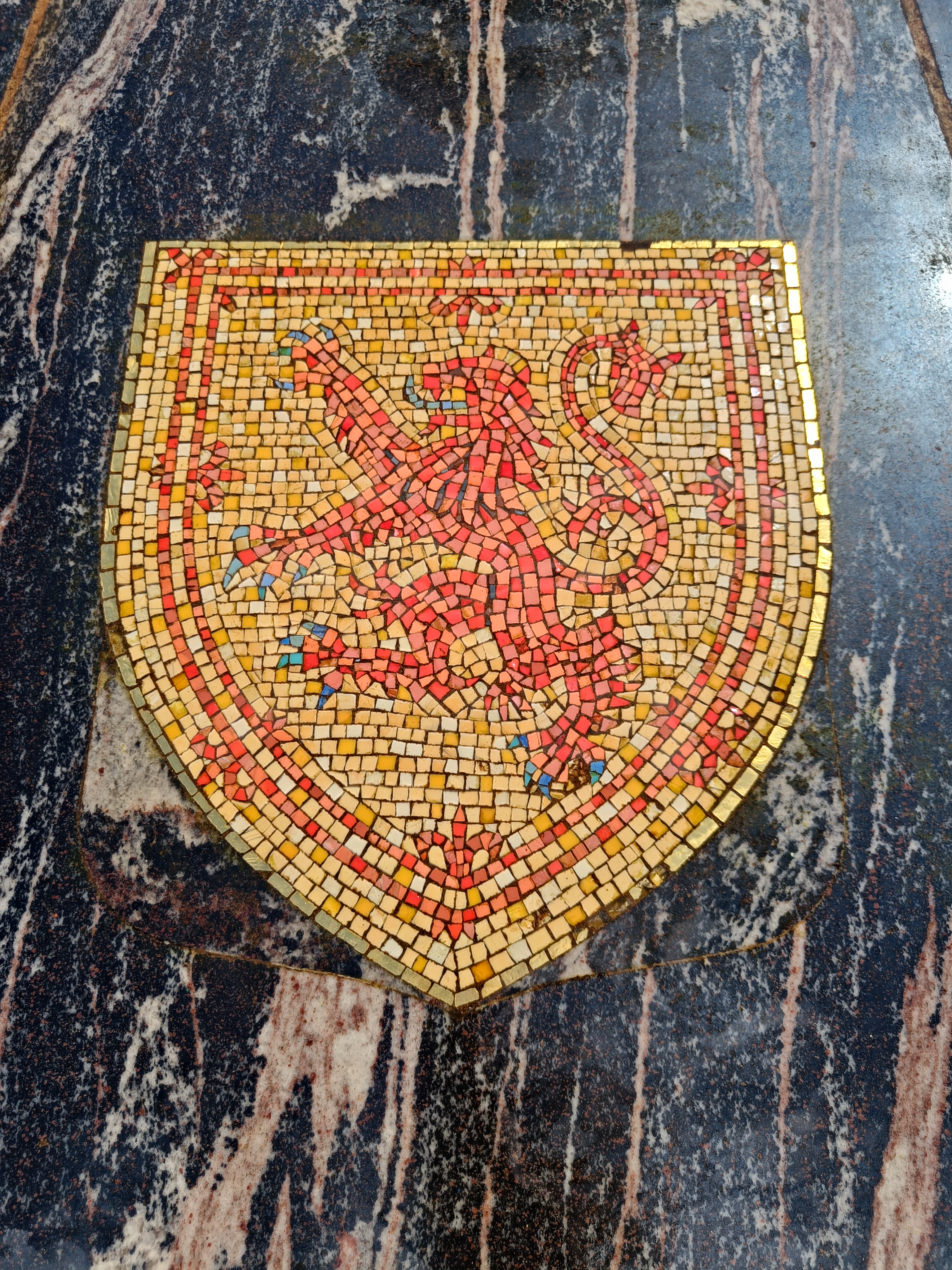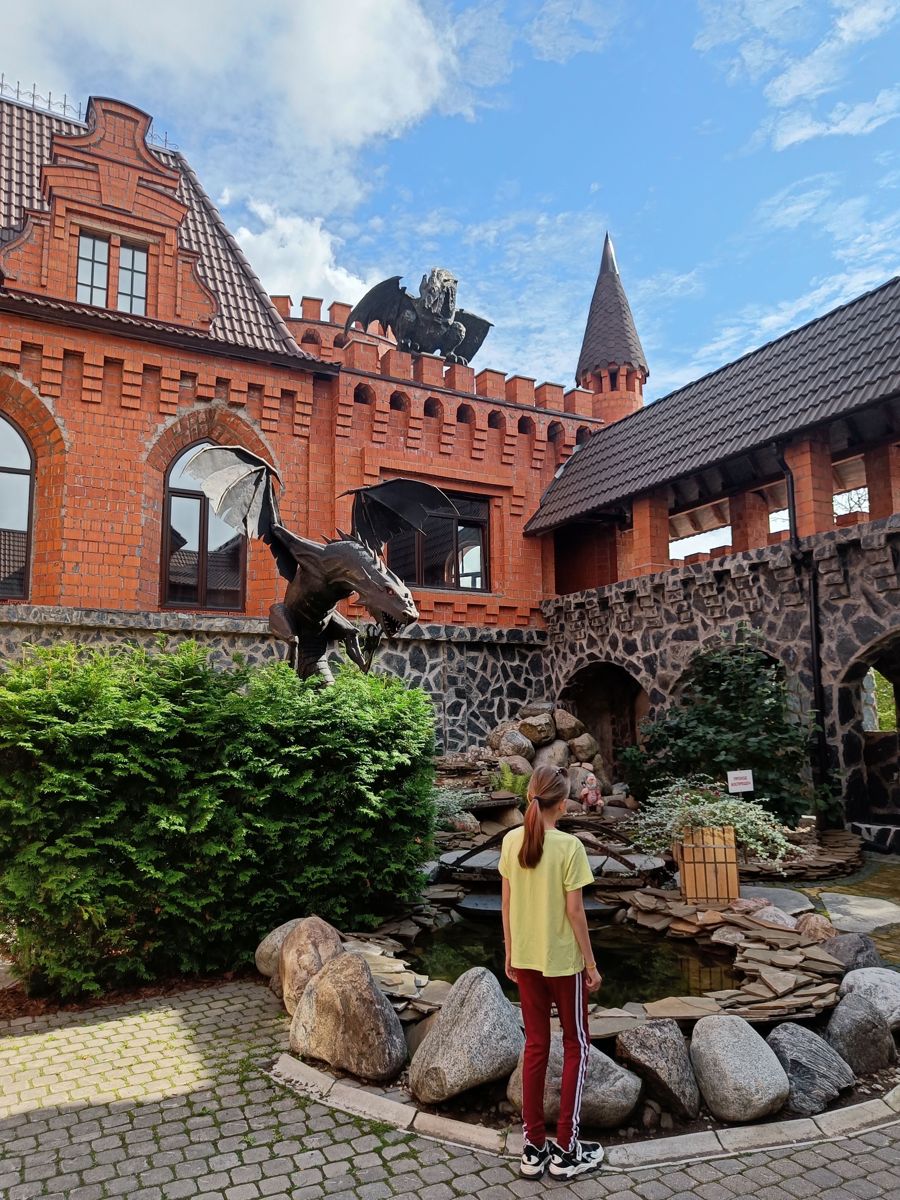 Внутри есть дворик со статуями драконов. К прудику подходить нельзя 🙁