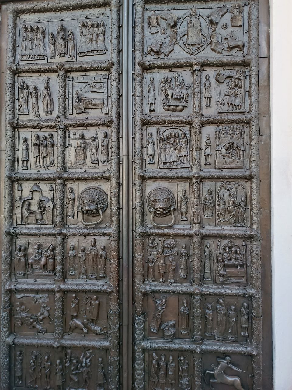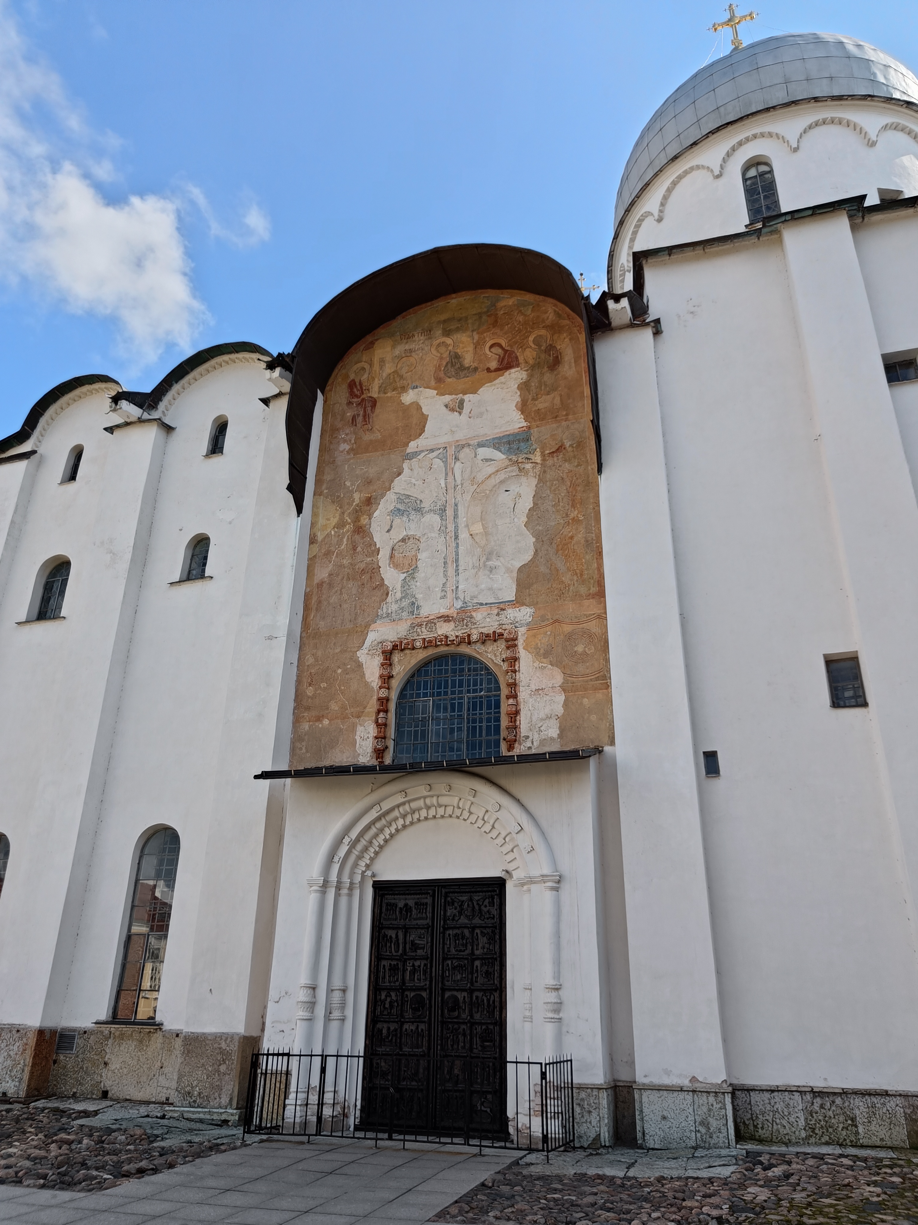 Главный — западный — портал храма украшен древними бронзовыми вратами.. Их выполнили в Магдебурге в середине XII в. немецкие мастера. В клеймах запечатлены сюжеты Ветхого и Нового Заветов, сцены символического характера и исторические лица: заказчик врат Плоцкий архиепископ Александр, мастера-литейщики Риквин и Вайсмут. Вероятно, изначально врата предназначались для собора в Плоцке; Новгород же приобрел это замечательное произведение западноевропейского бронзового литья, по-видимому, уже в первой половине XV в.. Местный мастер смонтировал створки врат, дополнив “заморское” изделие новыми рельефами и русскими переводами к латинским надписям. В нижней части левой створы он поместил “автопортрет” с атрибутами ремесла, подписав его кириллицей: “Аврам”