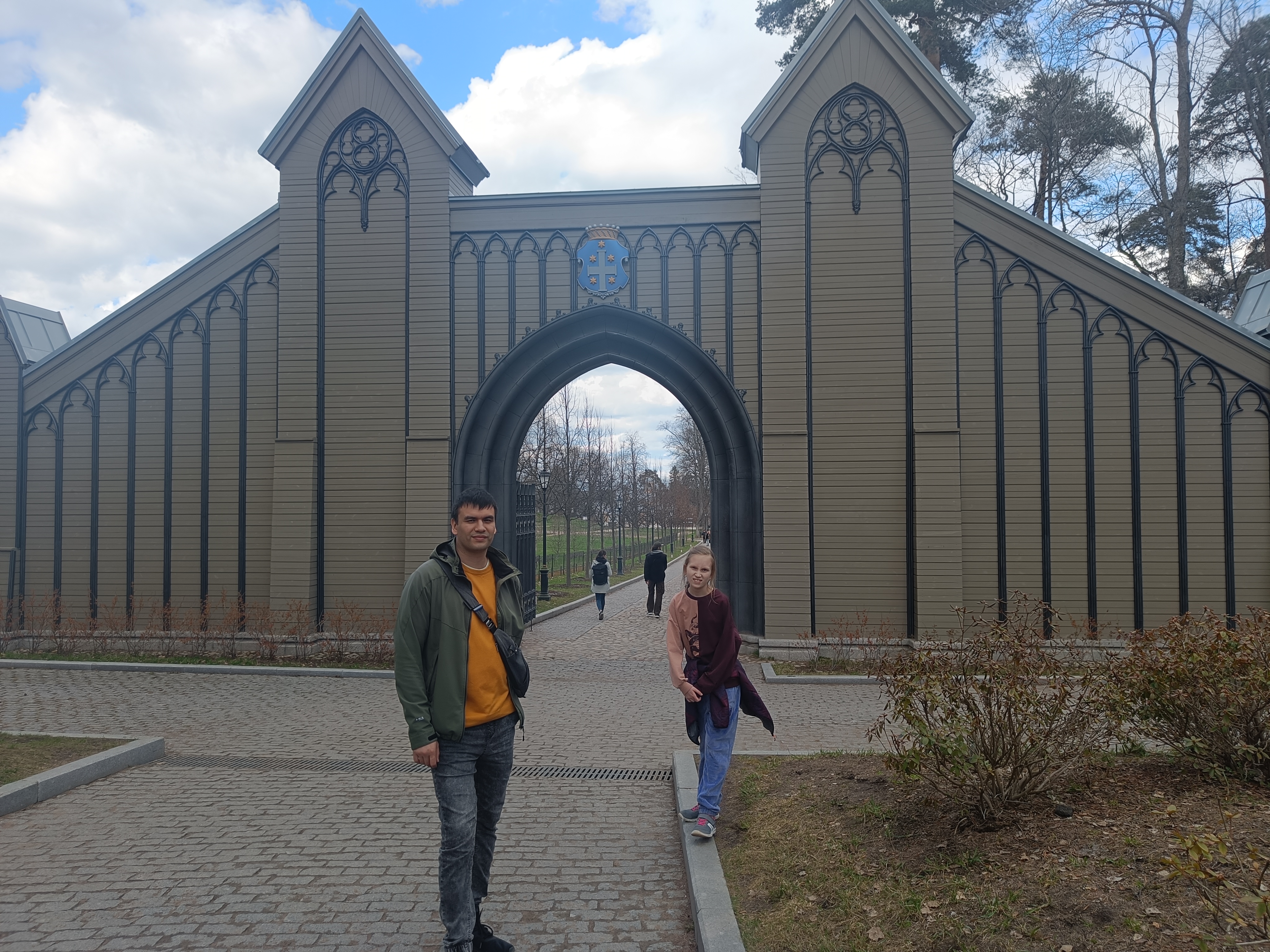 Въездные деревянные ворота в неоготическом стиле, украшенные стрельчатыми башнями и металлическим декором. Воссозданы в ходе реставрации.